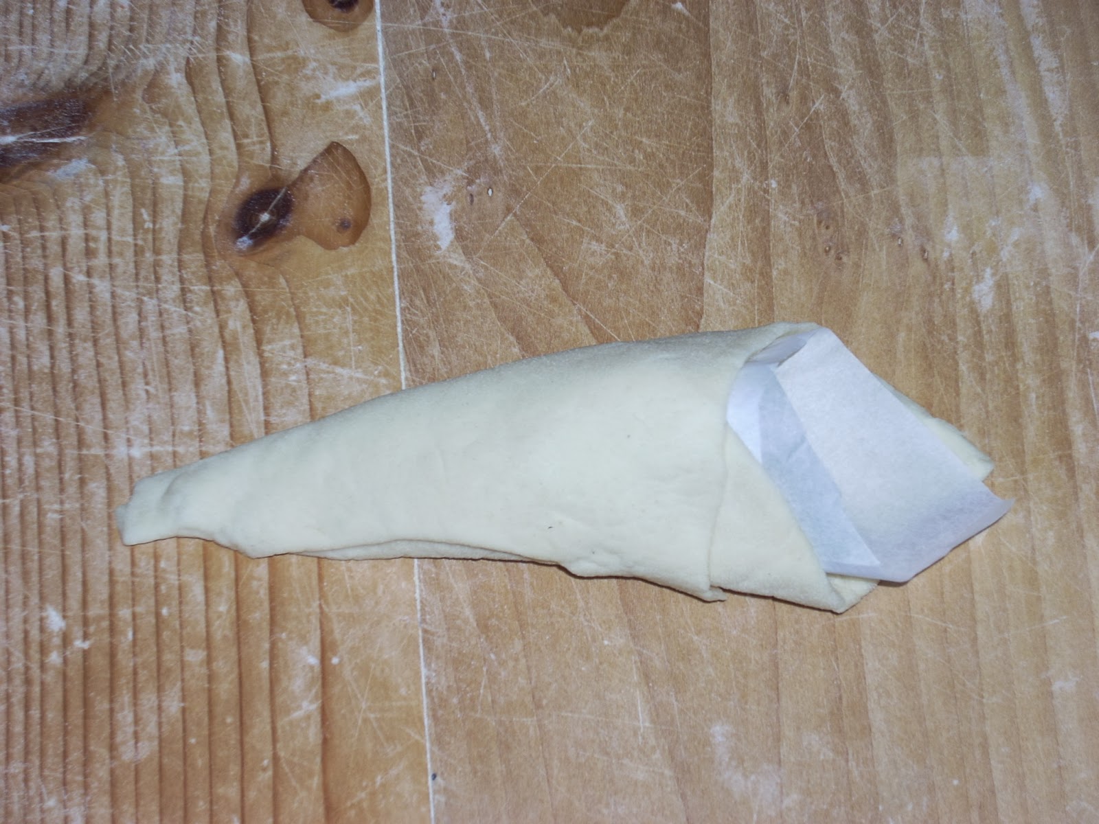 Prendere un pezzetto di impasto alla volta e assottigliarlo leggermente, preparare dei coni con la carta forno, avvolgere la sfoglia di impasto intorno al cono e se necessario tagliarla, posizionare all'interno del cono di carta una pallina di carta argentata in modo che dia la forma al cono